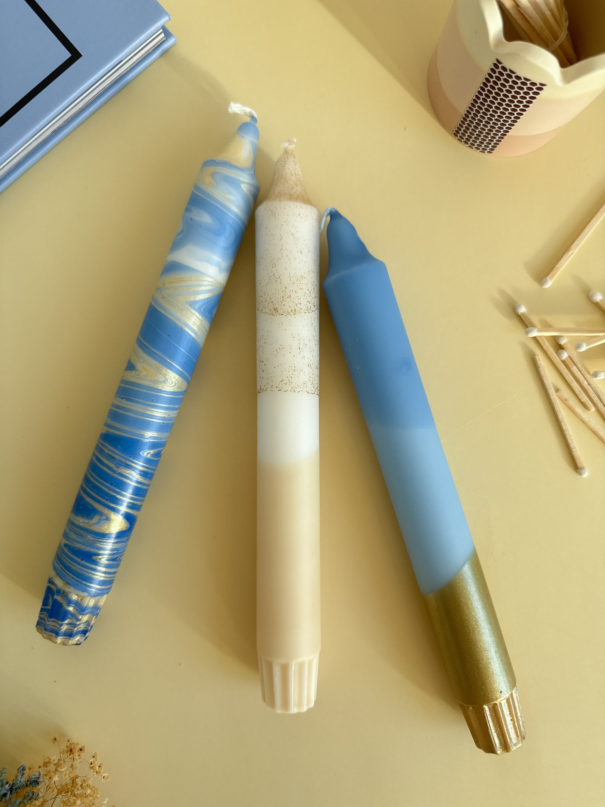 Stearin candles, wax dyes, marbling paints, glitter